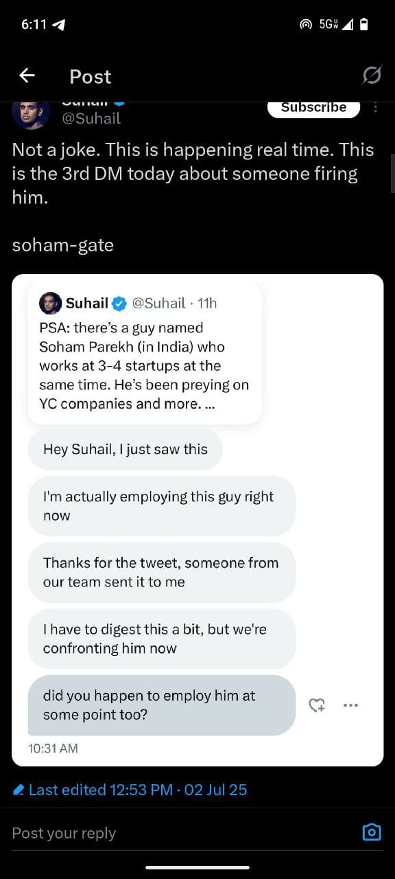 PSA: there’s a guy named Soham Parekh (in India) who works at 3-4 startups at the same time. He’s been preying on YC companies and more. Beware.