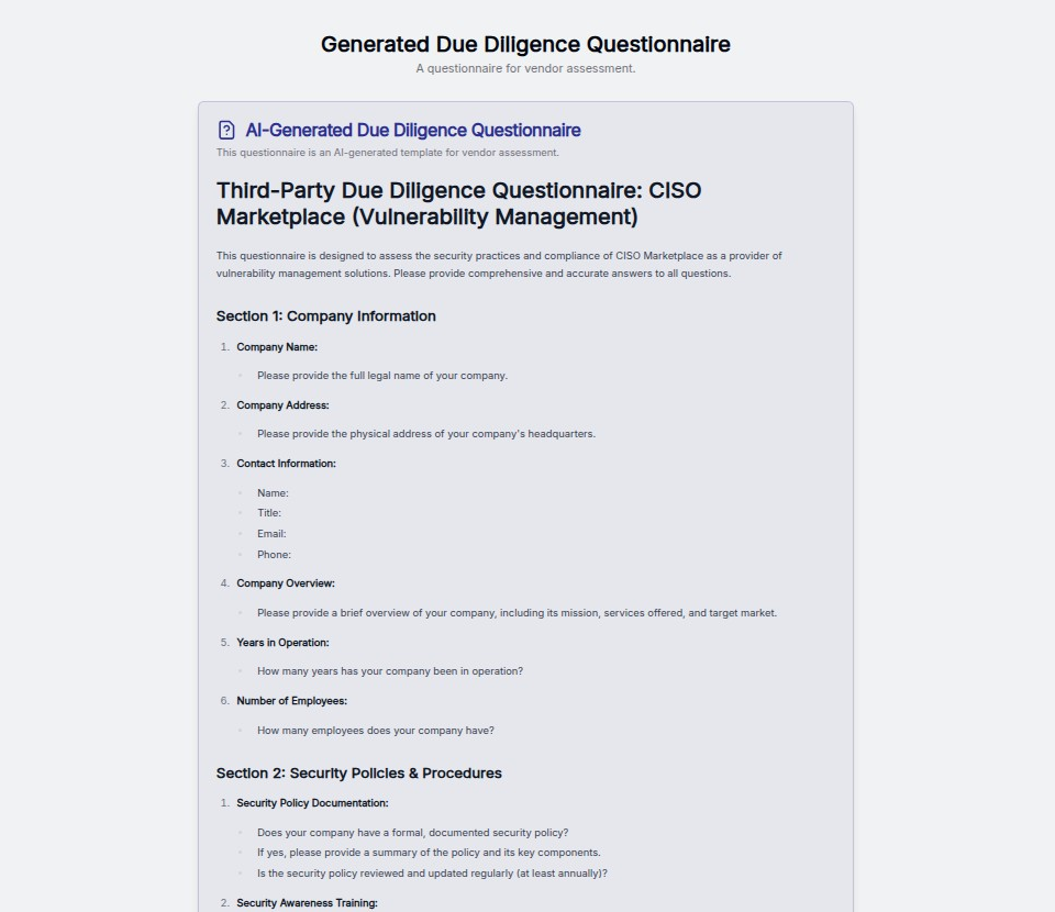 Instead of starting from scratch, VendorScope instantly generates comprehensive, customized questionnaires tailored to specific vendor types and security domains. Whether you're evaluating a vulnerability management platform or a cloud security tool, the AI creates relevant, thorough assessment frameworks in seconds.